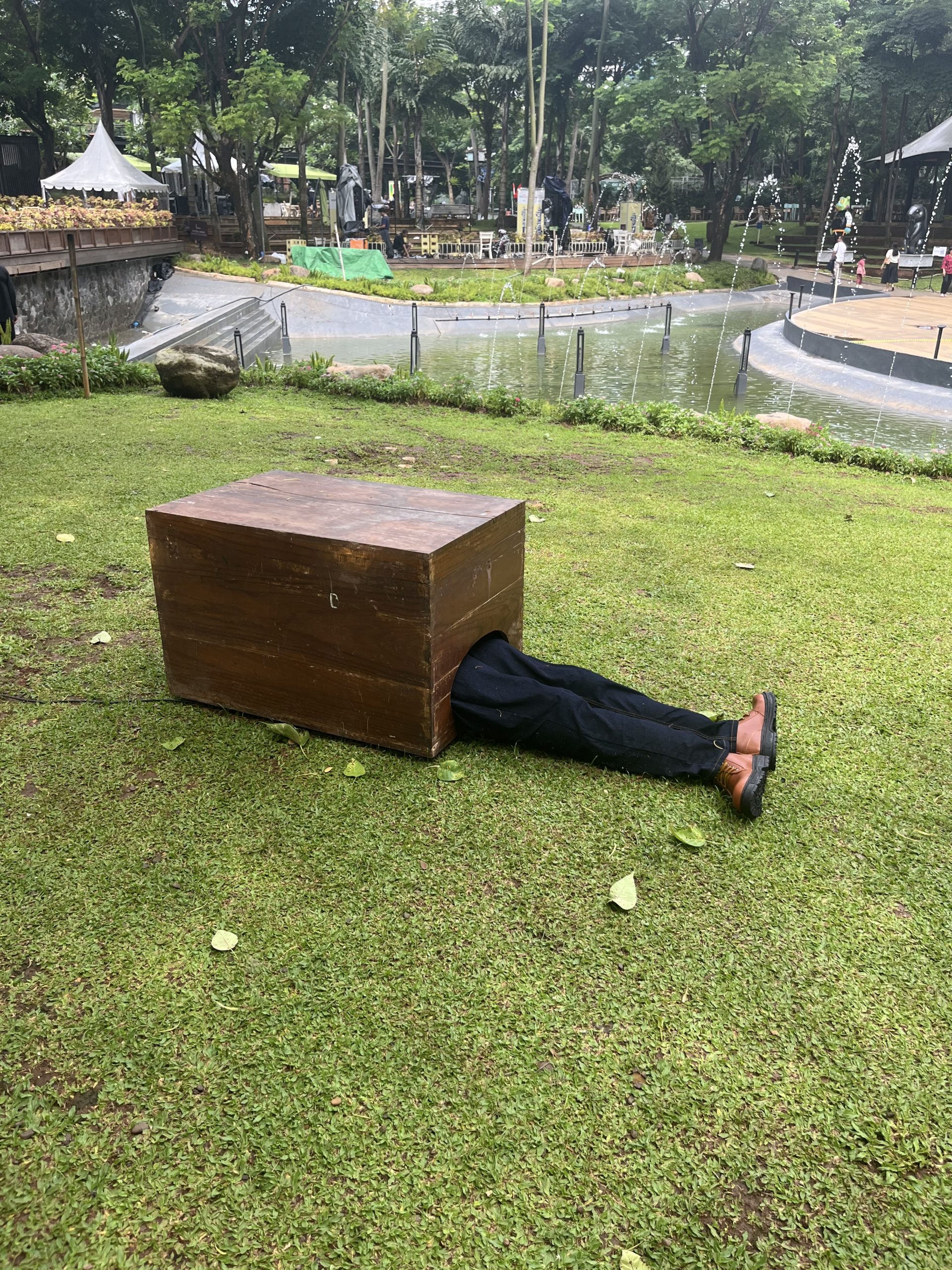 今回出品されたこの作品は、キャッチーで不気味で近寄りがたく、今にも起き上がりそう。それでも怖いもの見たさで目が離せない。何かが起きるかもしれないという期待感と少しの恐怖、ふと冷静に周囲を見てみると賑やかな公園に放置された恐らく男性の足に漂うすごい場違い感。そうしてずっと眺めていると、時折この足は不意にパタリと動き、そばにいる観客をギョッとさせる。一緒に連れて行った息子はこの作品を何度も見て、怖いながらも見たい触りたいと興味津々、倒れているおじさんを助けなくてはと話しかけたり夢中だった。面白いのが、足だけしか見えていないのに、息子がこの足を「おじさん」と表現していたこと。まだ3歳ながら、服装によるおおまかな男女の区別が、教えもしないのに知らず知らずのうちに染み込んでいる。