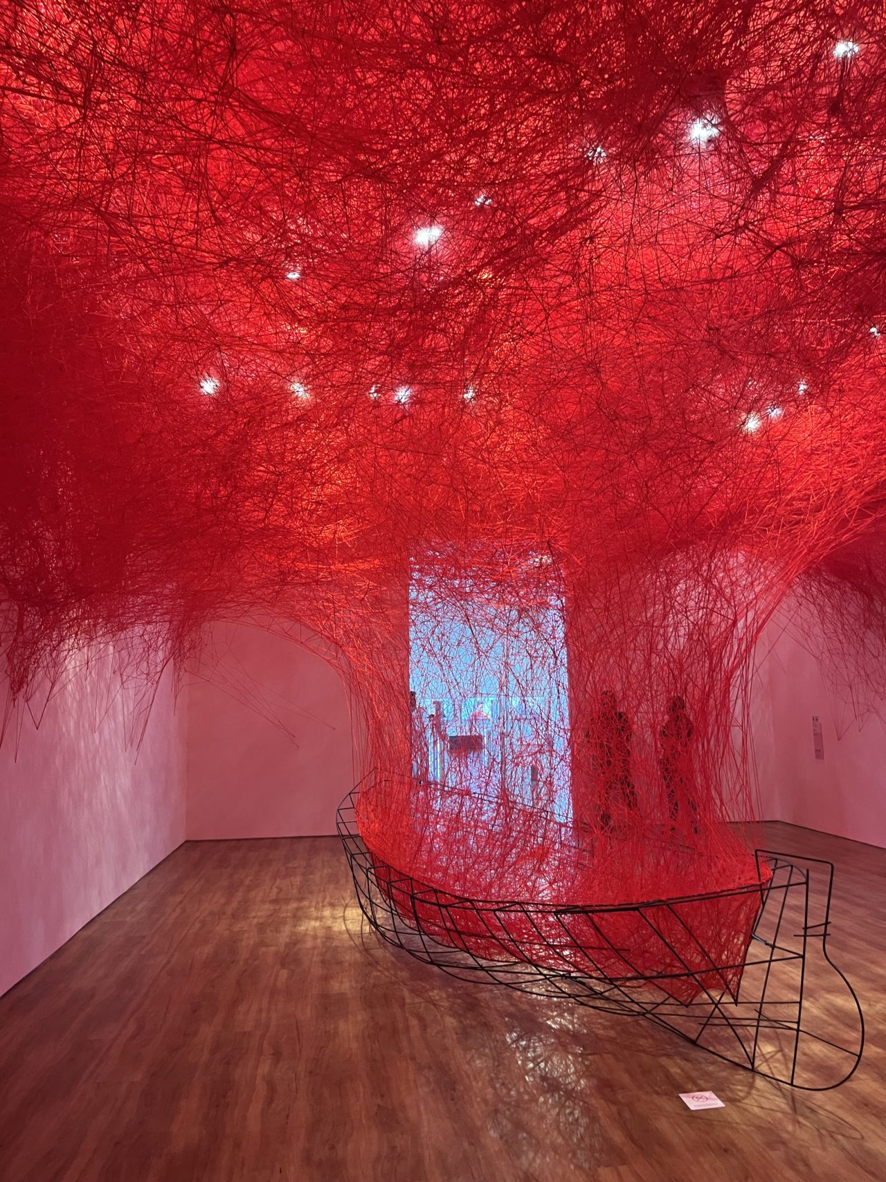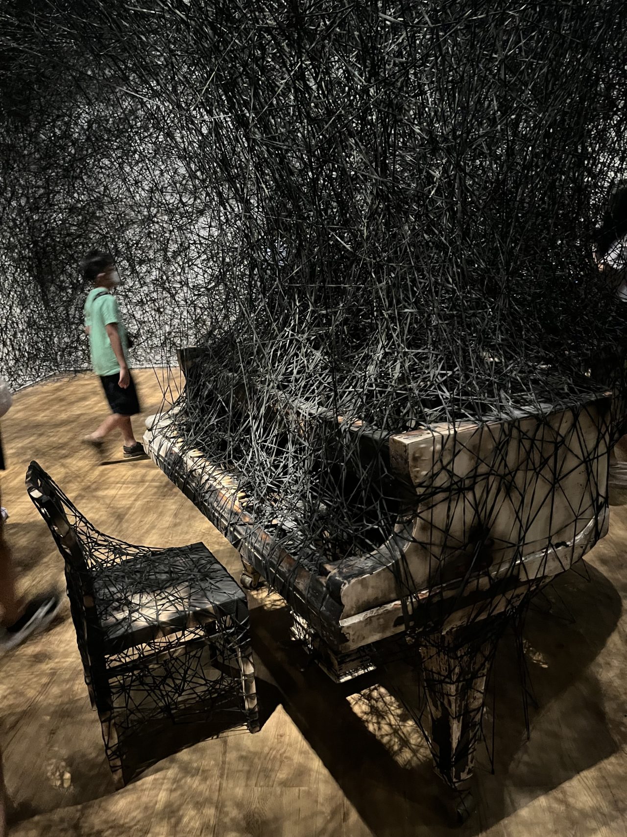代表作である真っ赤な無数の糸で覆われたインスタレーション《不確かな旅》や、燃えたグランドピアノの周りを黒い糸が埋め尽くす《静けさの中で》は、森美術館同様にたくさんの人が思い思いにカメラを向けていた。