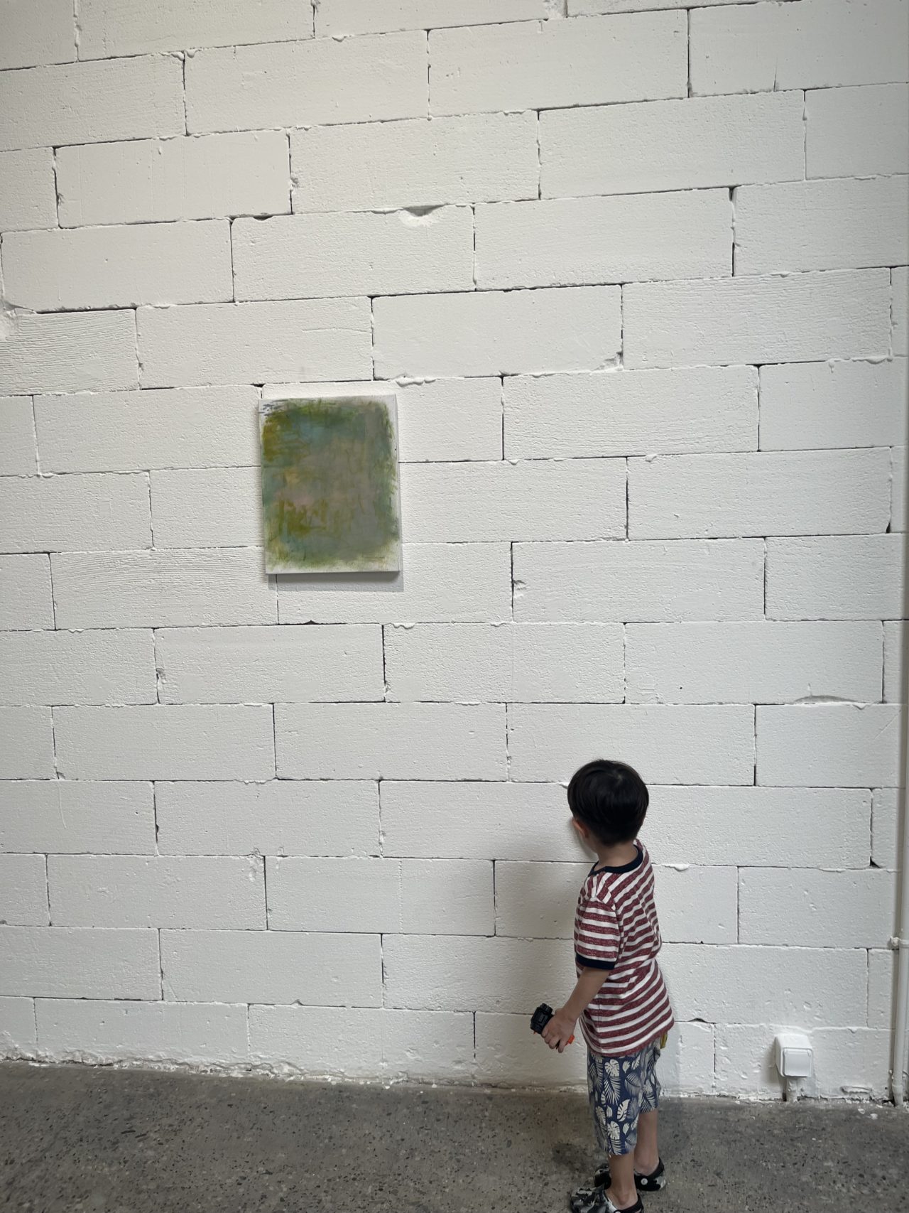 場所はサリナデパートの脇道に立つ雑居ビル。よく見ないと看板を見逃してわかりにくい。けれど、場所的にはまあまあ行きやすい。ただ、どのギャラリーもお昼過ぎからオープンするみたい。それぞれのギャラリーごとにオープン時間は確認した方がいい感じ。各ギャラリーのインスタグラムで確認してみたけれど、やってるのかやっていないのかイマイチ判然としない、情報が掴みにくいけれど、行ってみたらどこかはやってるかなと思って初訪問。息子は初めての現代アートギャラリー鑑賞。