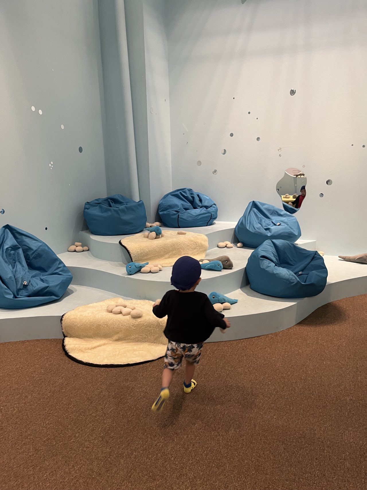床はふかふかで、ところどころカーペットやビーズクッションがあり、壁や鏡でキラキラ。とても心地よい空間。